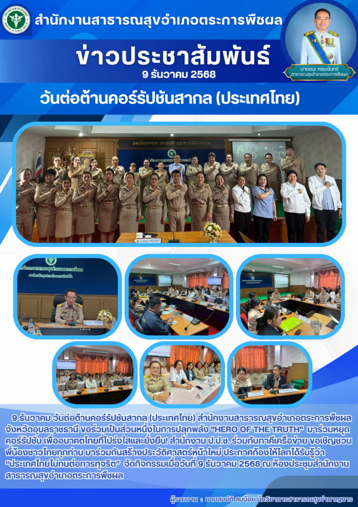 สำนักงาน ป.ป.ช. ร่วมกับภาคีเครือข่าย ขอเชิญชวนพี่น้องชาวไทยทุกท่าน มาร่วมกันสร้างประวัติศาสตร์หน้าใหม่ ประกาศก้องให้โลกได้รับรู้ว่า “ประเทศไทยไม่ทนต่อการทุจริต” จัดกิจกรรมเมื่อวันที่ 9 ธันวาคม 2568 ณ ห้องประชุมสำนักงานสาธารณสุขอำเภอตระการพืชผล