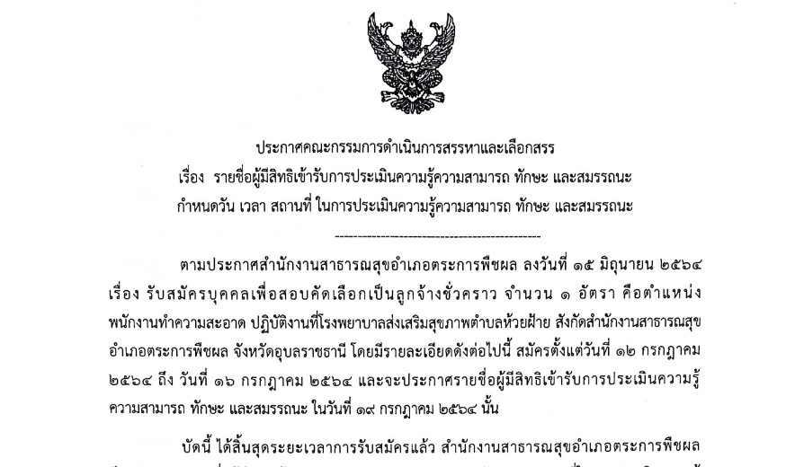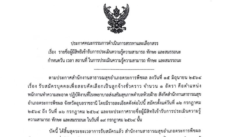 ประกาศรายชื่อผู้รับการประเมินความรู้ความสามารถ ทักษะ และสมรรถนะ เพื่อสอบคัดเลือกเป็นลูกจ้างชั่วคราว จำนวน ๑ อัตรา ตำแหน่งพนักงานทำความสะอาด ปฏิบัติงานที่โรงพยาบาลส่งเสริมสุขภาพตำบลห้วยฝ้าย สังกัดสำนักงานสาธารณสุขอำเภอตระการพืชผล จังหวัดอุบลราชธานี โดยสมัครตั้งแต่วันที่ ๑๒ – ๑๖ กรกฎาคม ๒๕๖๔ และประกาศรายชื่อผู้มีสิทธิสอบเข้ารับการประเมินความรู้ความสามารถทักษะ และสมรรถนะ ในวันที่ ๑๙ กรกฏาคม ๒๕๖๔ ตามไฟล์ที่แนบ คลิกที่นี่