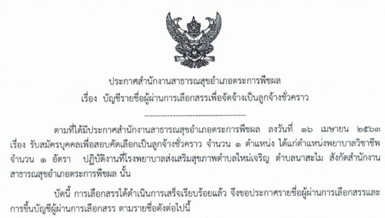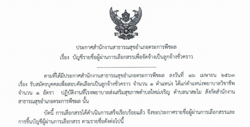 ประกาศผลผู้ผ่านการเลือกสรร ลูกจ้างชั่วคราว พยาบาลวิชาชีพ ปฏิบัติงานที่ โรงพยาบาลส่งเสริมสุขภาพตำบลใหม่เจริญ อำเภอตระการพืชผล จังหวัดอุบลราชธานี คลิก