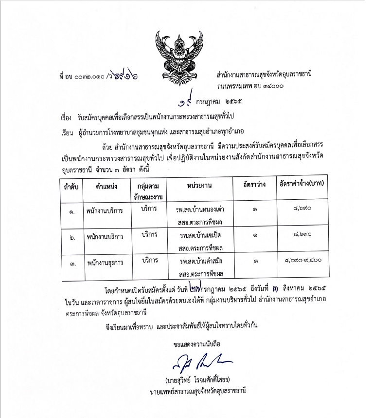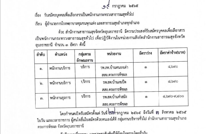 สำนักงานสาธารณสุขจังหวัดอุบลราชธานี มีความประสงค์รับสมัครบุคลเพื่อเลือกสรร