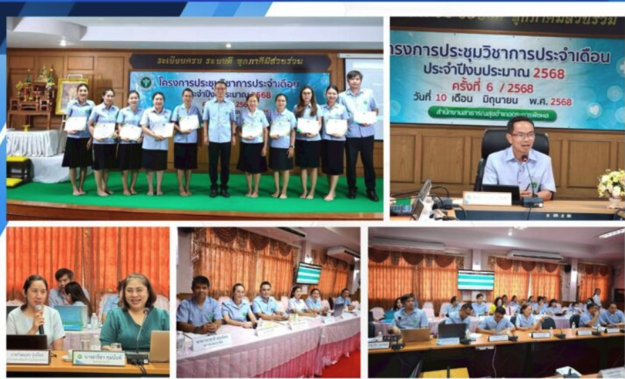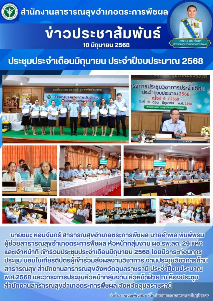 นายชนะ หอมจันทร์ สาธารณสุขอำเภอตระการพืชผล นายอำพล พิมพ์พรม ผู้ช่วยสาธารณสุขอำเภอตระการพืชผล หัวหน้ากลุ่มงาน ผอ.รพ.สต. 29 แห่ง และเจ้าหน้าที่ เข้าร่วมประชุมประจำเดือนมิถุนายน 2568 โดยมีวาระก่อนการประชุม มอบใบเกียรติบัตรผู้เข้าร่วมส่งผลงานวิชาการ งานประชุมวิชาการด้านสาธารณสุข สำนักงานสาธารณสุขจังหวัดอุบลราชธานี ประจำปีงบประมาณ พ.ศ.2568 และวาระการประชุมหัวหน้ากลุ่มงาน หัวหน้าฝ่าย ณ ห้องประชุมสำนักงานสาธารณสุขอำเภอตระการพืชผล จังหวัดอุบลราชธานี