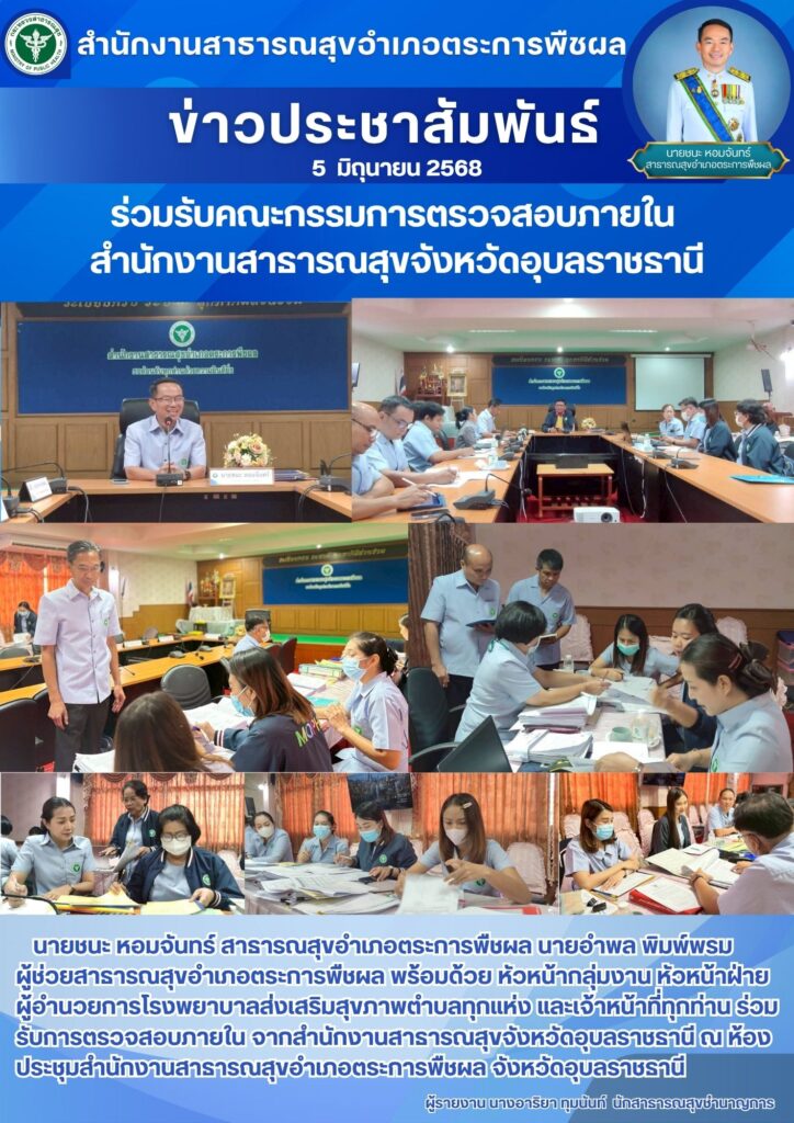 นายชนะ หอมจันทร์ สาธารณสุขอำเภอตระการพืชผล นายอำพล พิมพ์พรม ผู้ช่วยสาธารณสุขอำเภอตระการพืชผล พร้อมด้วย หัวหน้ากลุ่มงาน หัวหน้าฝ่าย ผู้อำนวยการโรงพยาบาลส่งเสริมสุขภาพตำบลทุกแห่ง และเจ้าหน้าที่ ร่วมรับการตรวจสอบภายใน สำนักงานสาธารณสุขอำเภอตระการพืชผล และโรงพยาบาลส่งเสริมสุขภาพตำบลกุดยาลวน จากคณะกรรมการตรวจสอบภายใน สำนักงานสาธารณสุขจังหวัดอุบลราชธานี