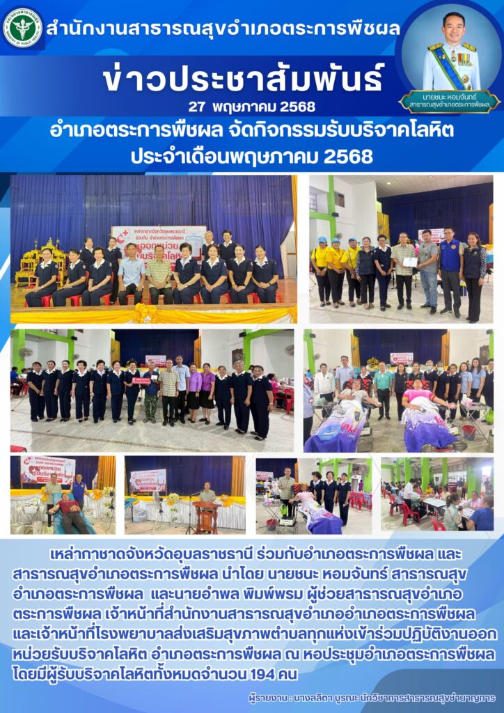 เหล่ากาชาดจังหวัดอุบลราชธานี ร่วมกับอำเภอตระการพืชผล และสาธารณสุขอำเภอตระการพืชผล นำโดย นายชนะ หอมจันทร์ สาธารณสุขอำเภอตระการพืชผล และนายอำพล พิมพ์พรม ผู้ช่วยสาธารณสุขอำเภอตระการพืชผล เจ้าหน้าที่สำนักงานสาธารณสุขอำเภออำเภอตระการพืชผล และเจ้าหน้าที่โรงพยาบาลส่งเสริมสุขภาพตำบลทุกแห่งเข้าร่วมปฏิบัติงานออกหน่วยรับบริจาคโลหิต อำเภอตระการพืชผล ณ หอประชุมอำเภอตระการพืชผล โดยมีผู้รับบริจาคโลหิตทั้งหมดจำนวน 194 คน