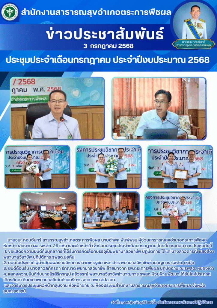 นายชนะ หอมจันทร์ สาธารณสุขอำเภอตระการพืชผล นายอำพล พิมพ์พรม ผู้ช่วยสาธารณสุขอำเภอตระการพืชผล หัวหน้ากลุ่มงาน ผอ.รพ.สต. 29 แห่ง และเจ้าหน้าที่ เข้าร่วมประชุมประจำเดือนกรกฎาคม โดยมีวาระก่อน การประชุมดังนี้